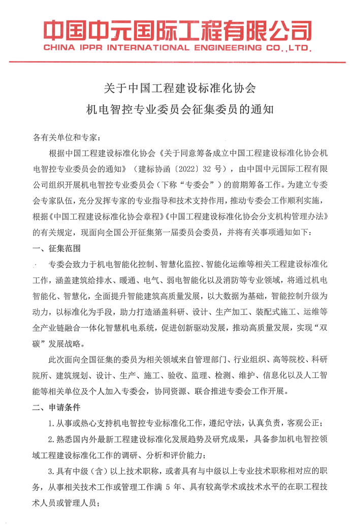 关于中国工程建设标准化协会机电智控专业委员会征集委员的通知