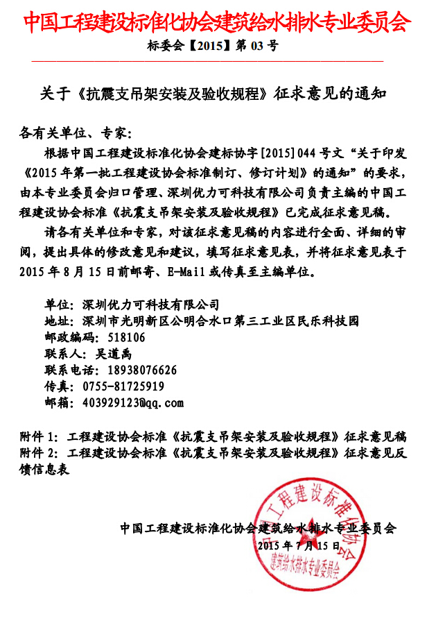 关于《抗震支吊架安装及验收规程》 征求意见的通知