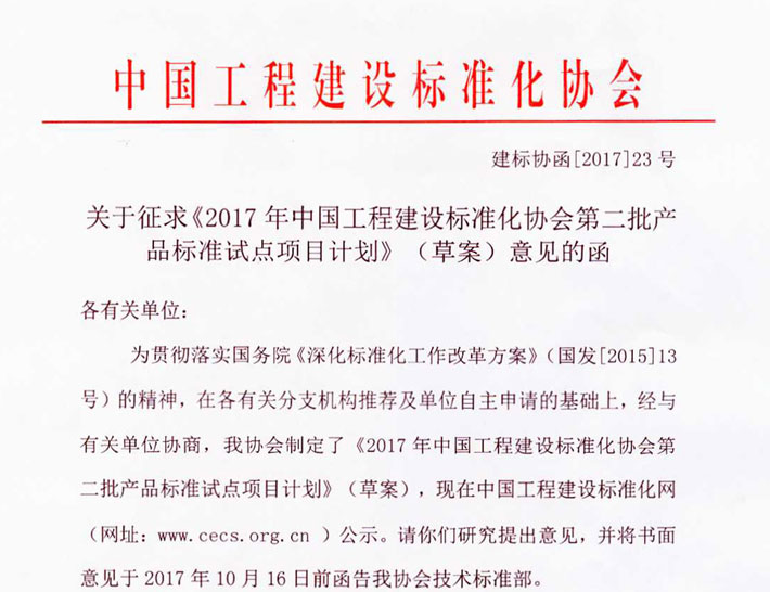 关于征求《2017年中国工程建设标准化协会第二批产品标准试点项目计划》(草案)意见的函